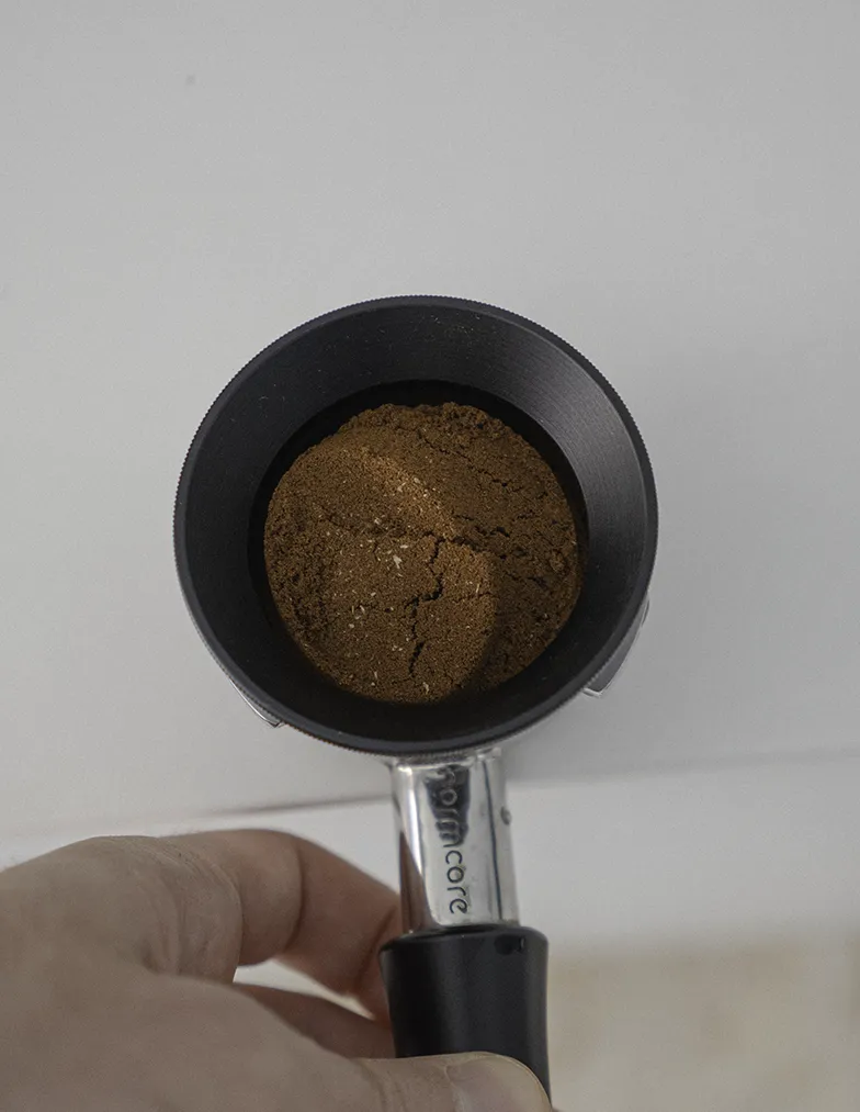 En el caso del tamper V4 de Normcore además, hay un reborde que se asienta encima del borde de la cesta del portafiltro, lo que consigue colocar el tamper en una posición totalmente perpendicular durante el prensado, nivelando la pastilla de café y generando un prensado uniforme.