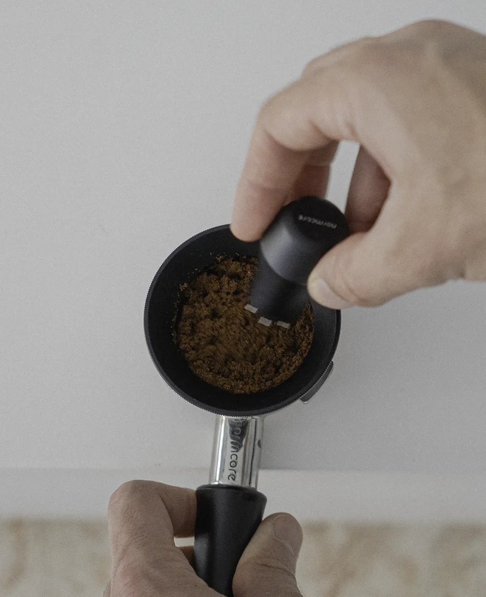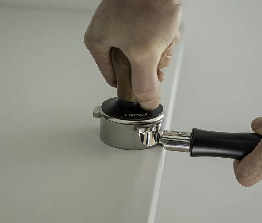 In the case of Normcore’s V4 tamper, there’s also a rim that sits on top of the edge of the portafilter basket, which positions the tamper in a completely perpendicular position during tamping, leveling the coffee puck and generating uniform tamping.